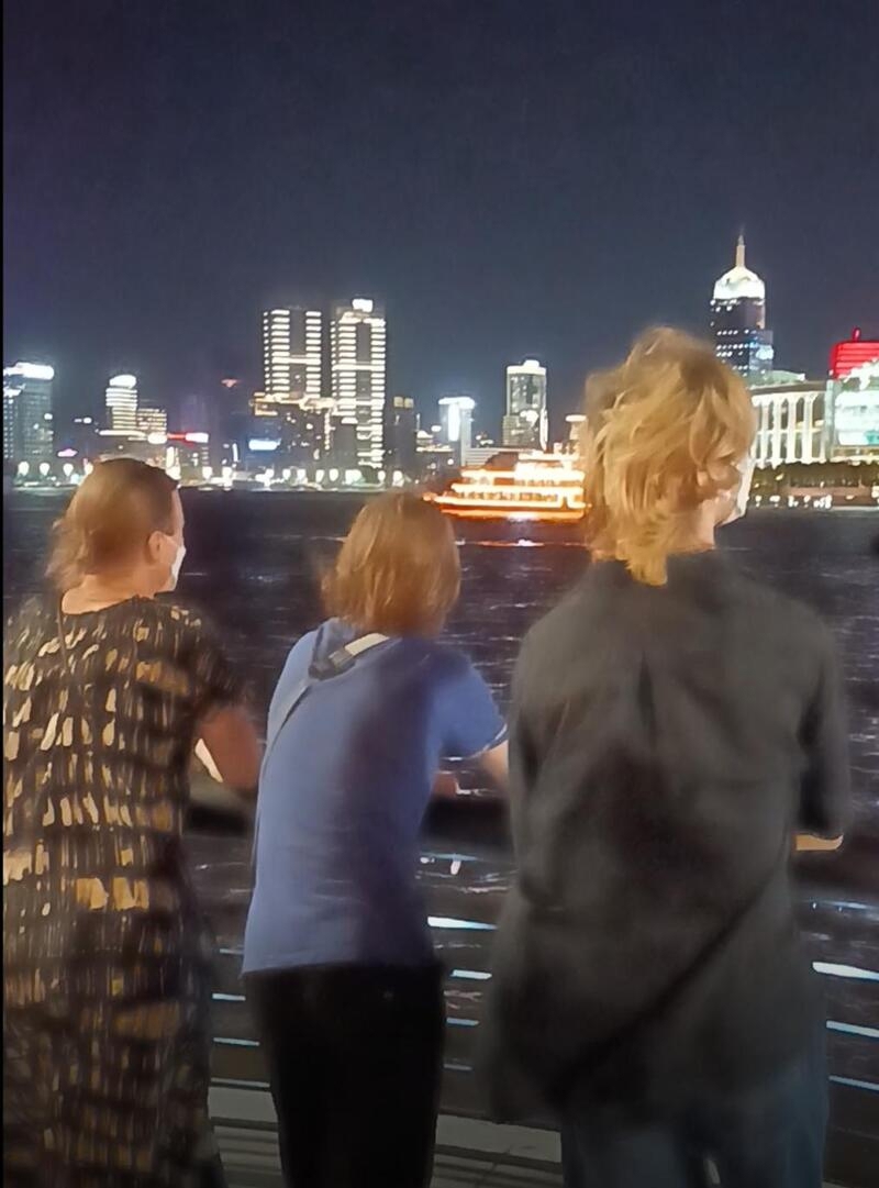 奥克森的妻子和两个孩子在上海外滩欣赏夜景。
