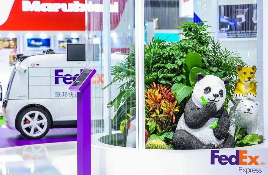 2021年,联邦快递回归进博,展台还原其安全运送珍稀动物的场景,其中自2000年起,仅跨国运送大熊猫就成功执行了9次;