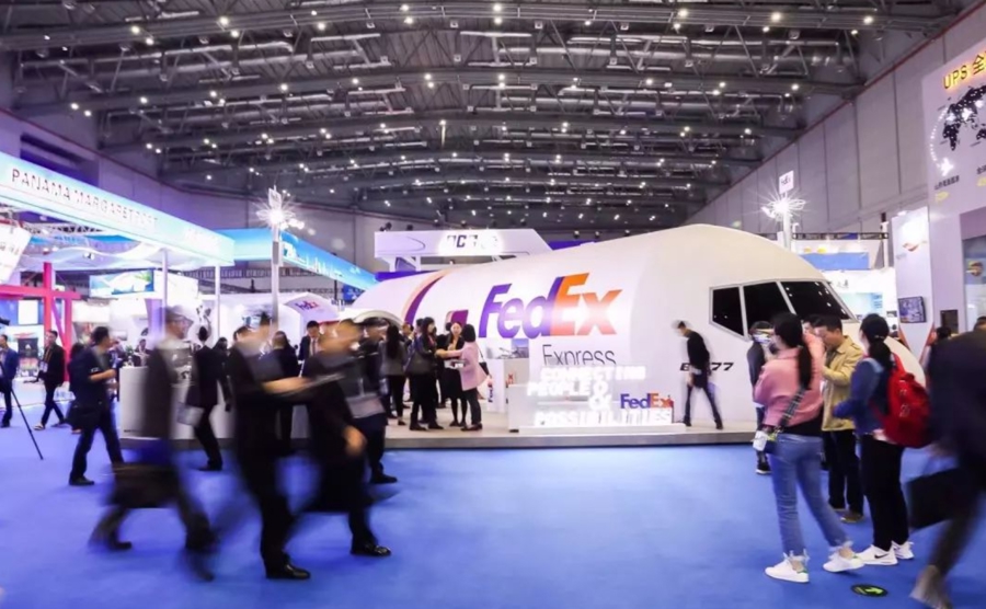 首届进博会,联邦快递将展台设计成停机坪,一架FedEx777货机模型,帮助人们沉浸式体验联邦快递支持中国进口贸易的物流解决方案与技术;